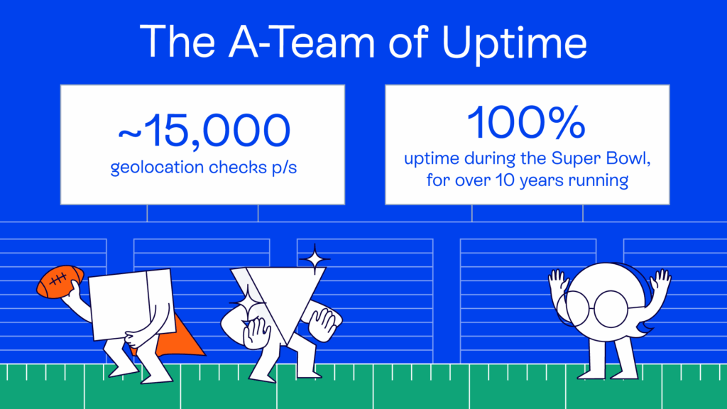 It’s easy to throw a number up on a website. It takes a lot more to receive and process ~15,000 geolocation checks per second and maintain zero reported player-impacting downtime during the Super Bowl—for over 10 years running.