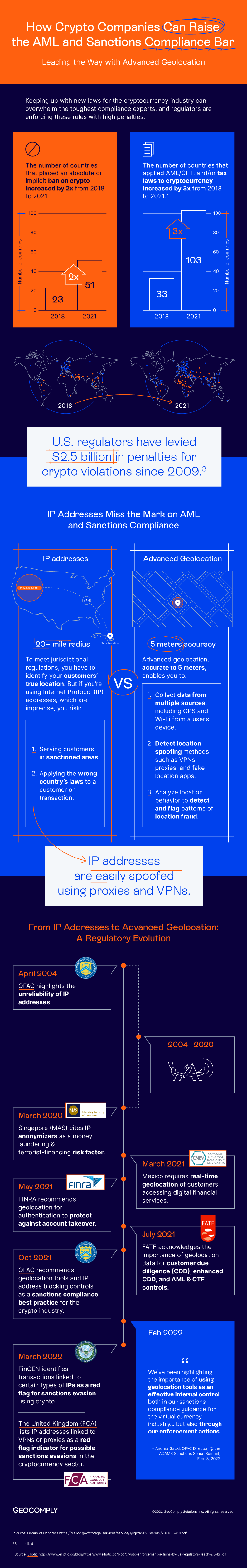 Regulators have long said that digital assets are a popular way for bad actors to commit financial crime and fraud. These crimes include money laundering, sanctions evasions, and ransomware payments. It is no surprise that KYC, sanctions, and AML compliance are top priorities for lawmakers. That’s where geolocation compliance comes in.