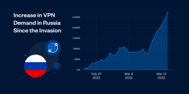 Chart showing daily VPN demand increases in Russia compared with the daily average between Feb. 17-23, 2022. Source: Top10VPN.com