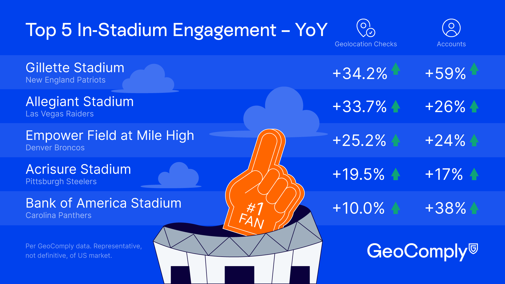 Five stadiums stood out for year-over-year growth in in-stadium geolocation checks and active account growth. Together, these metrics serve as strong proxies for in-stadium betting engagement: