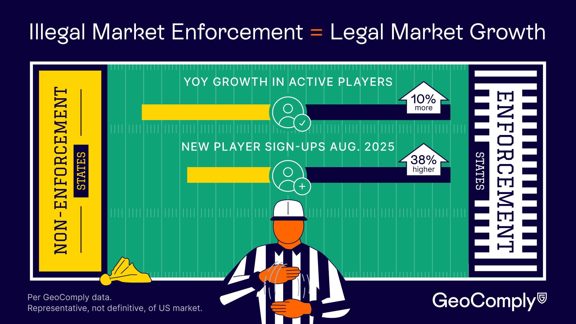[2 September 2025] – As the 2025 NFL season kicks off, the U.S. sports betting industry and millions of football fans are gearing up for the busiest time of the year. At the same time, new analysis from GeoComply shows that state enforcement actions against illegal offshore sportsbooks are driving measurable growth in the legal, regulated market.