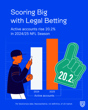 *Active accounts is based on GeoComply’s aggregated user data for its US sportsbook customers in regulated states during the NFL regular season. The data does not include Florida.